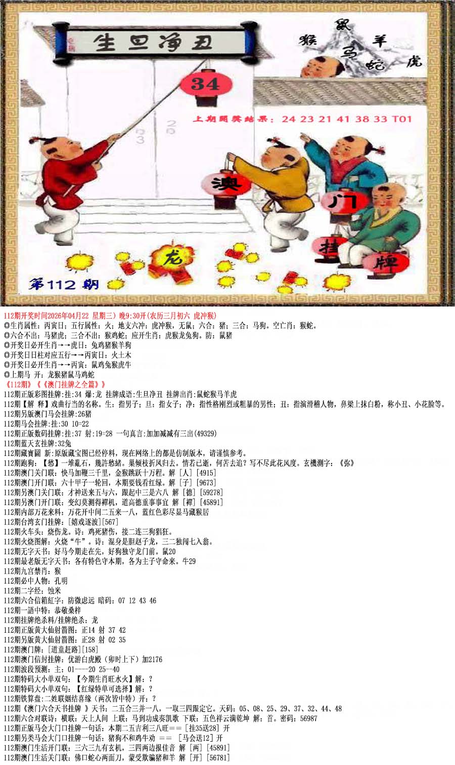 | 112期 | 虎 | 红双 | 0尾 | 3头 | 开?00准 |